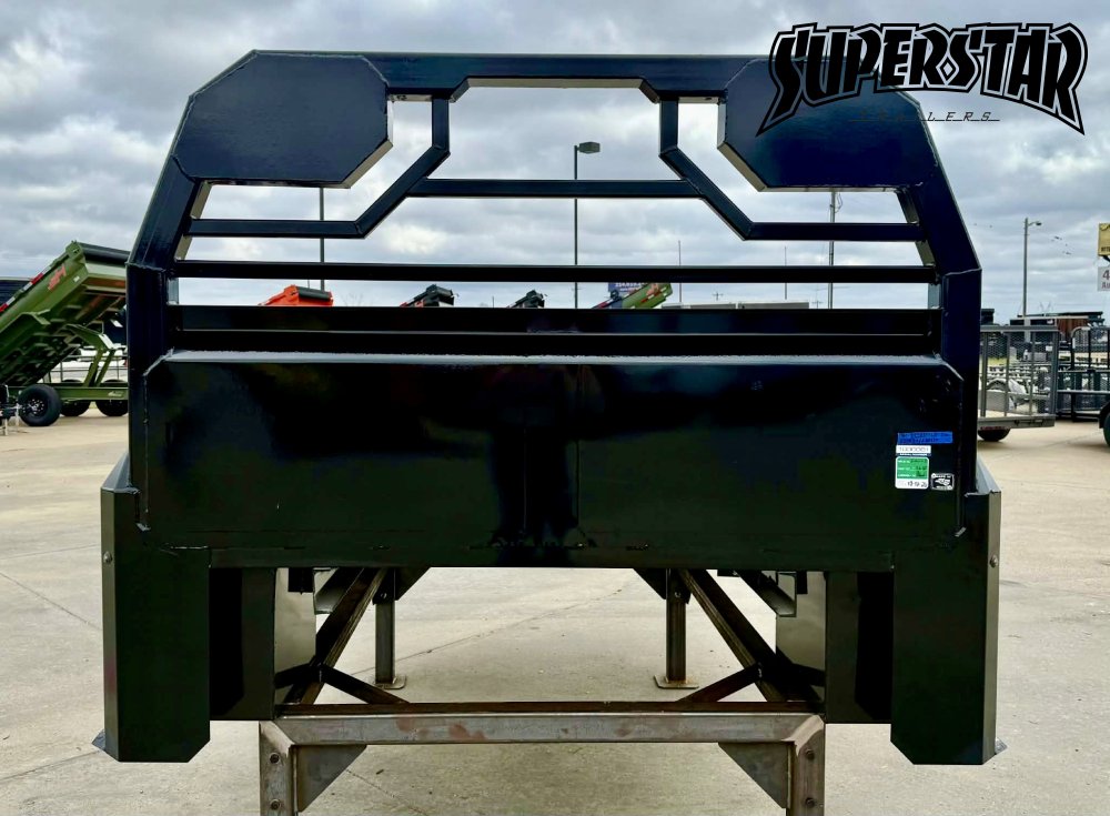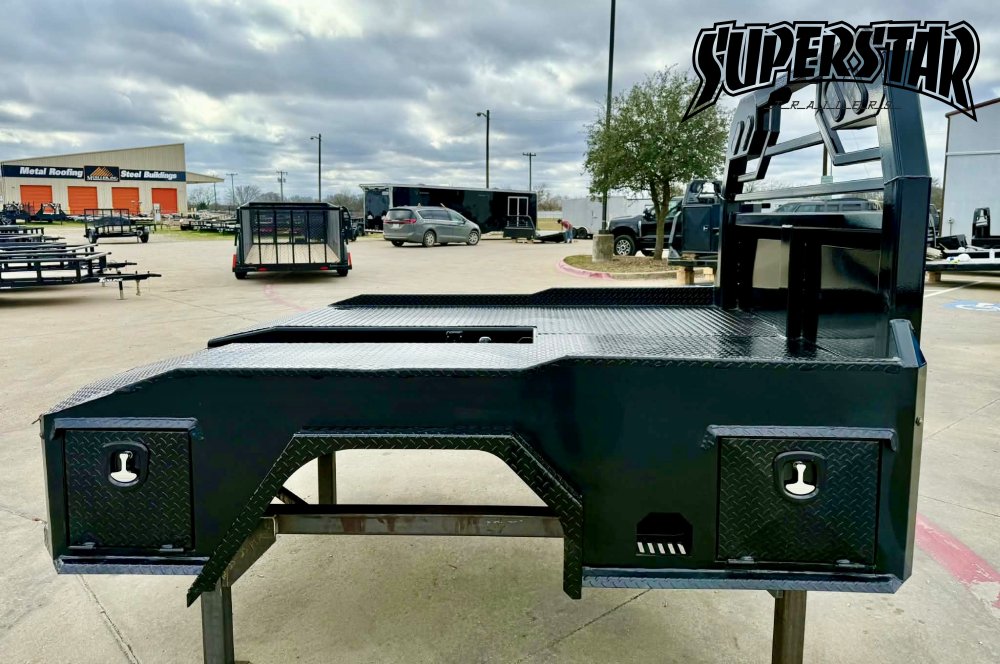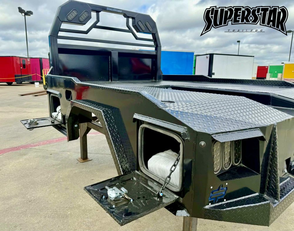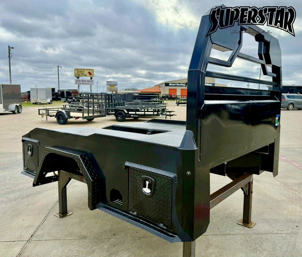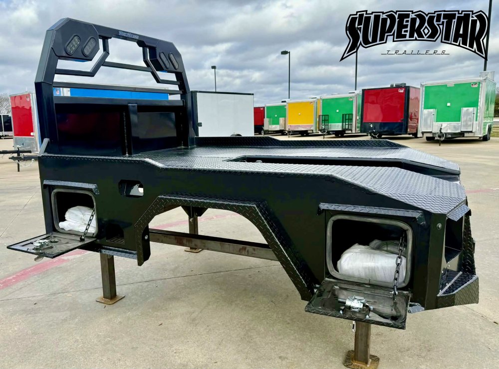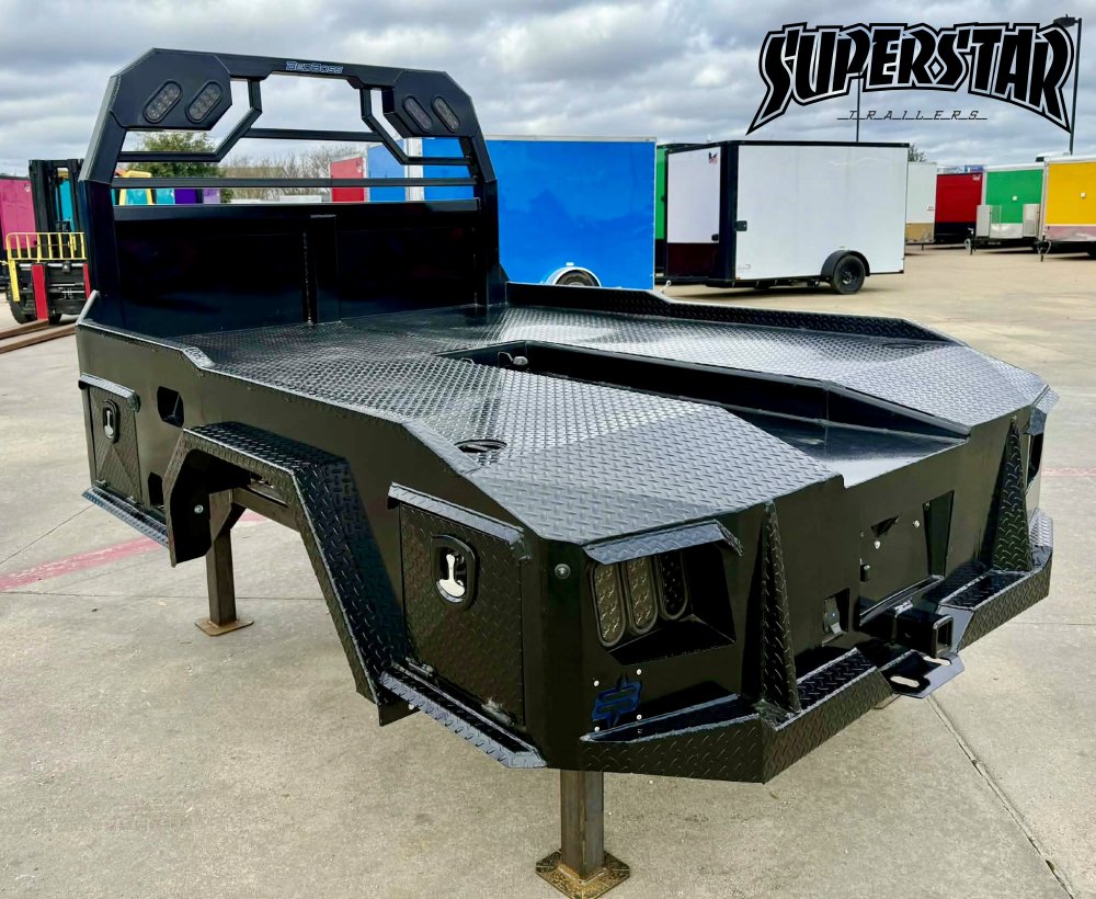 Built on a 4" steel channel frame with a diamond-plate deck, this bed includes a reinforced headache rack, integrated gooseneck trough, and multiple access toolboxes. The no-skirt layout keeps it open and accessible for field adaptability.