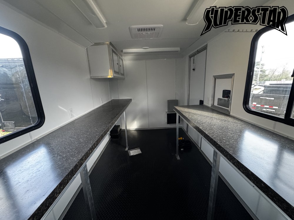 Features: 13.5 BTU Roof Air, 2 5/16" Coupler, 50 Amp Electric PKG, 7 Way RV Style Plug, Brake-Away, Curb Side Door, Finished Interior, Generator Platform, LED Exterior Lights, LED Interior Lights, One-Piece Aluminum Roof, Rear Side Door, Road Side Door, Roof Vent, Rubber Coin Flooring, Screwless Exterior